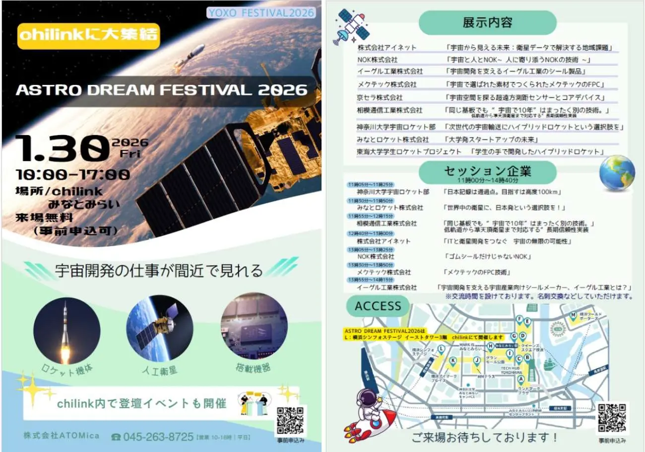 ASTRO DREAM FESTIVAL 2026とは、chilinkを起点に出会った宇宙関連企業・大学・団体が主体となり、横浜未来機構主催の「YOXO FESTIVAL」への共創出展として開催される「宇宙」をテーマにしたイベントです。