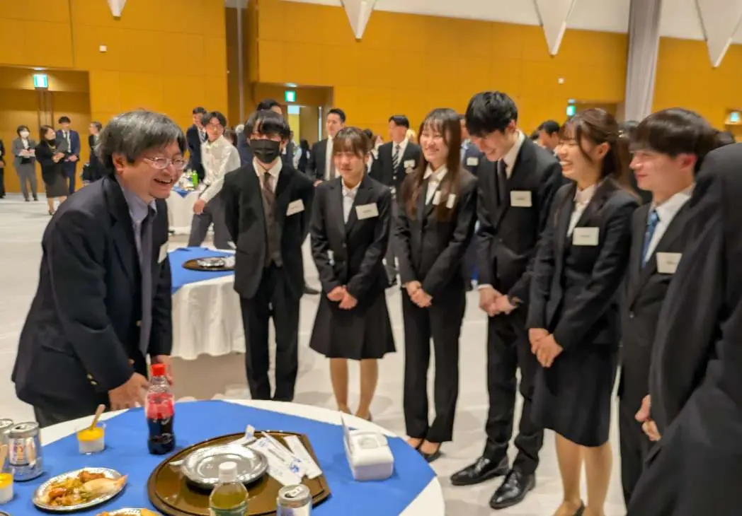 歓談の途中では、第101回日本学生選手権水泳競技大会において、昨年に引き続き女子総合優勝、個人でも好成績を収めた「水泳部」、神奈川大学野球連盟リーグ戦で3連覇を果たし、第56回明治神宮野球大会においてベスト8の成績を収めた「硬式野球部」、本年度の大学祭の実施運営を担当した「神大フェスタ実行委員会」、「みなとみらい祭実行委員会」の4団体の学生代表者から来年度に向けた抱負が語られました。