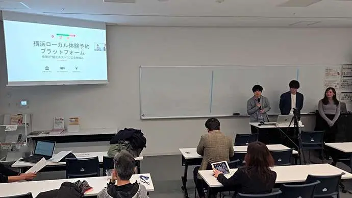 また、本年度は、2つのグループに分かれ、中間報告(2回)及び最終報告として、「横浜観光・MICEの課題と解決を考える」をテーマにプレゼンテーションを行いました。受講生は、横浜やみなとみらいの現状と課題について、講義で学んだことを活かしながら、事業としてどのように解決していくかをまとめ、発表しました。発表後は質疑応答を行い、講師及び受講生間で活発な意見交換を行いました。