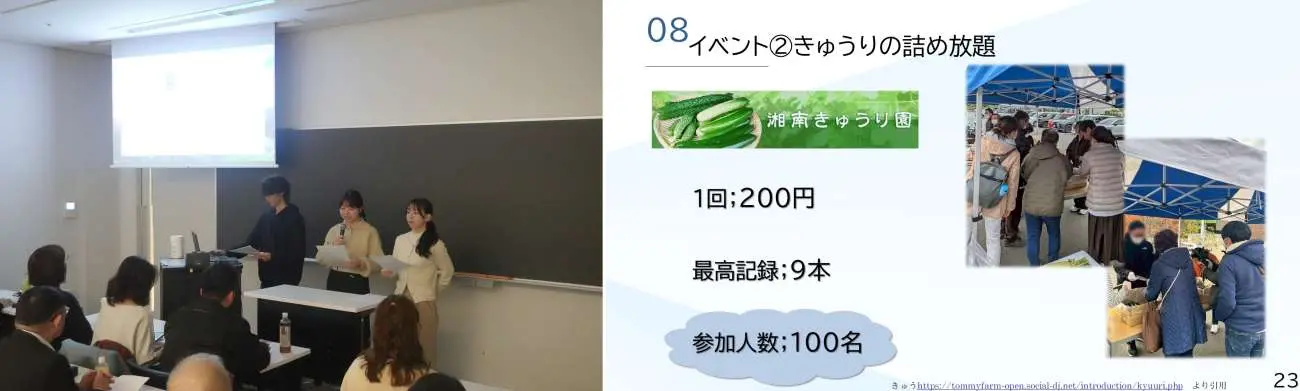 活動内容:来場者の年代・居住地域・買い物ニーズを調査し、それを基にイベントを企画した。計350件ほどのアンケートを基に、「みかんの詰め放題」「きゅうりの詰め放題」「マリネの試食会」を実施した。
