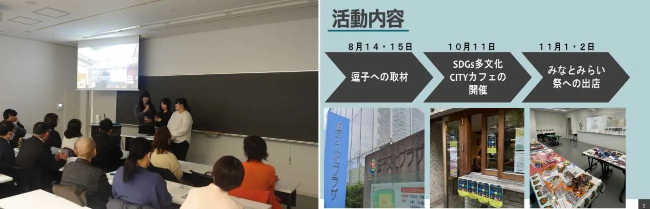 活動内容:幅広い世代にフェアトレードに触れる機会を提供することを目標に据え、フェアトレードタウンの逗子に足を運びインタビューを行った。多文化CITYカフェ、みなとみらい祭というフェアトレードに関するイベントも実施した。