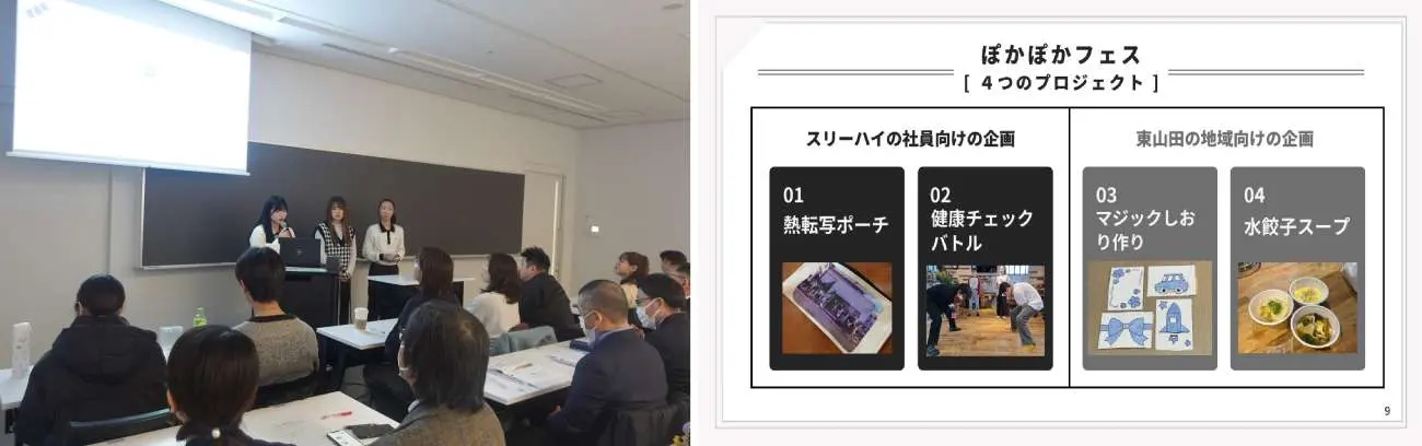 活動内容:ステークホルダー別の課題を設けるが、「温かさを伝える」ことが活動の指針となった。社員向け企画では「熱転写ポーチ作り」、地域向けイベントでは「マジックしおり作り」など、複数のイベントを実施した。