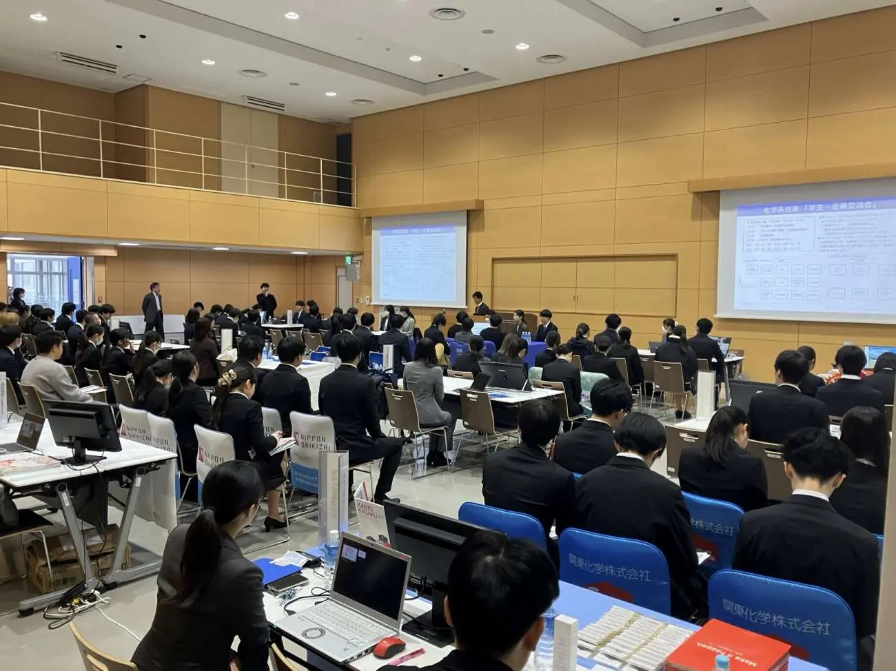 化学生命学部主催の就職活動支援イベント「学生-企業交流会」が開催されました。化学品、化粧品など様々な業界の企業19社が参加し、就職活動に関する情報を説明して頂きました。学部3年生と修士1年生のほか、学部2年生の参加も見られました。