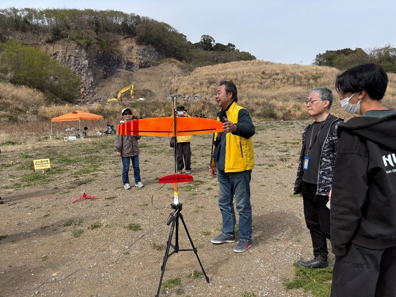 打上には、1日目にモデルロケット教室で指導を行った日本モデルロケット協会、日大ロケット研究会4名および横浜市立横浜サイエンスフロンティア高等学校・附属中学校の学生8名に加え、早稲田大学WASAの学生13名が参加しました。神奈川大学宇宙ロケット部は、現在附属学校と開発を進めているペットボトルハイブリッドロケットの開発が完了すれば打ち上げる予定でしたが、エンジン燃焼後にタンク側に火炎がさかのぼる「逆火」問題が解消できず、参加を見送りました。