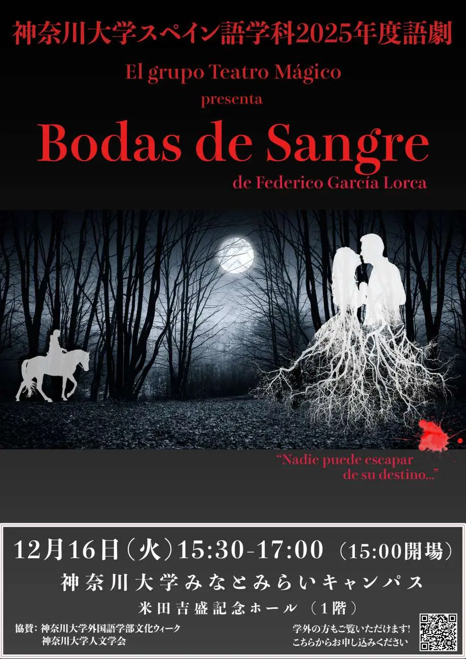 12月16日(火)、スペイン語学科では、みなとみらいキャンパス1階・米田吉盛記念ホールにて、ガルシア・ロルカ作『Bodas de Sangre』(邦題:『血の婚礼』)のスペイン語劇を上演いたします。本公演では、舞台装置や小道具、照明、衣装の制作まで、すべて学生が主体となって準備を進めてきました。出演する学生たちは、全編スペイン語での演技に挑戦し、これまでの学びを生かした表現に取り組んでいます。当日は、どなたでも自由にご観覧いただけます。ぜひお誘いあわせのうえ、学生たちが心を込めてつくり上げた舞台を会場にてご覧ください。