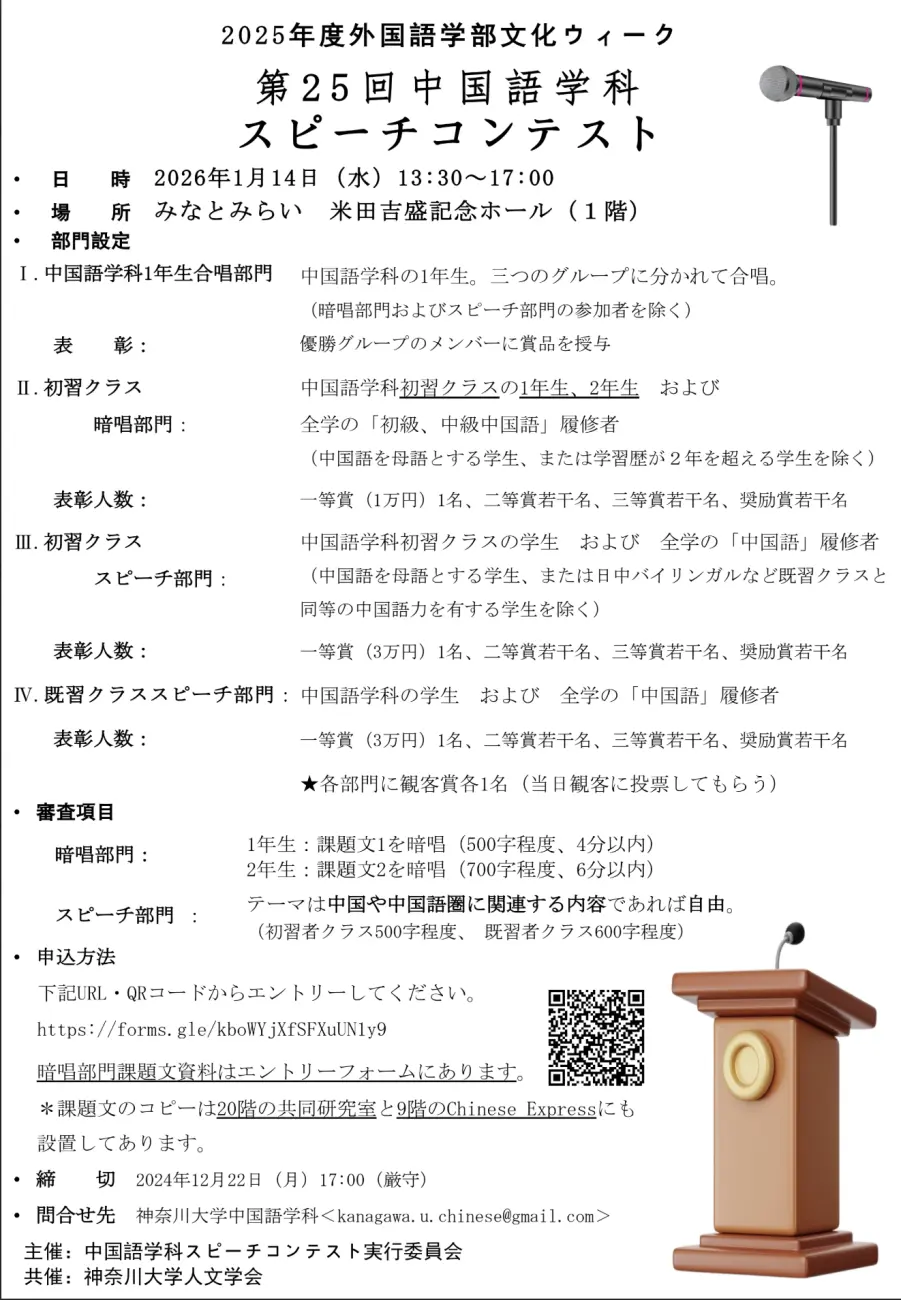 第25回 中国語学科スピーチコンテスト(2026年1月14日)開催のお知らせ