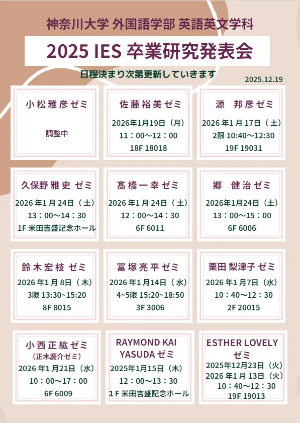 英語英文学科 IESプログラム「卒業論文」の発表会を左記の日程・会場でおこないます。
