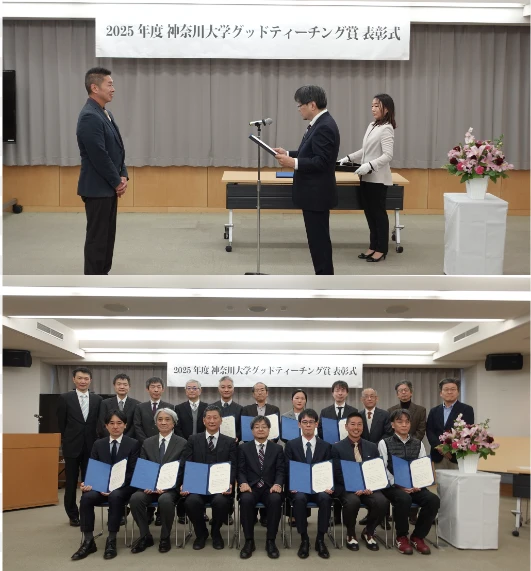 神奈川大学のFD・SD 活動を活性化し、教育の質の向上をはかることを目的とする「神奈川大学グッドティーチング表彰制度」では、2025年度から①共通教養科⽬及び資格教育課程科⽬(講義科⽬)(講義以外の科目)②文系学部専攻科目(講義科⽬)(講義以外の科目)③理系学部(講義科⽬)(講義以外の科目)の6つのカテゴリーで、学生による「教育改善のための学生による授業アンケート」の結果をもとに、最優秀の授業を担当された先生への表彰がおこなわれるようになりました。