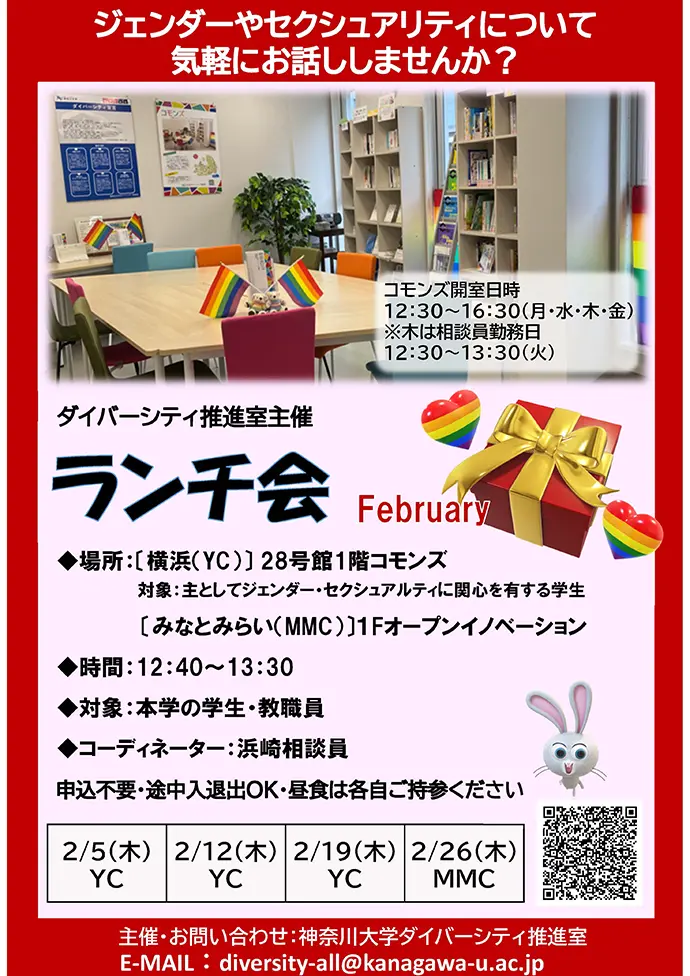 | 場所 | 【横浜キャンパス】 28号館1階111室 ※B1Fと誤認されやすいため、ご注意ください コモンズ(対象:主としてジェンダー・セクシュアリティに関心を有する学生) 【みなとみらいキャンパス】 1Fオープンイノベーション ※レインボーフラッグが目印です |