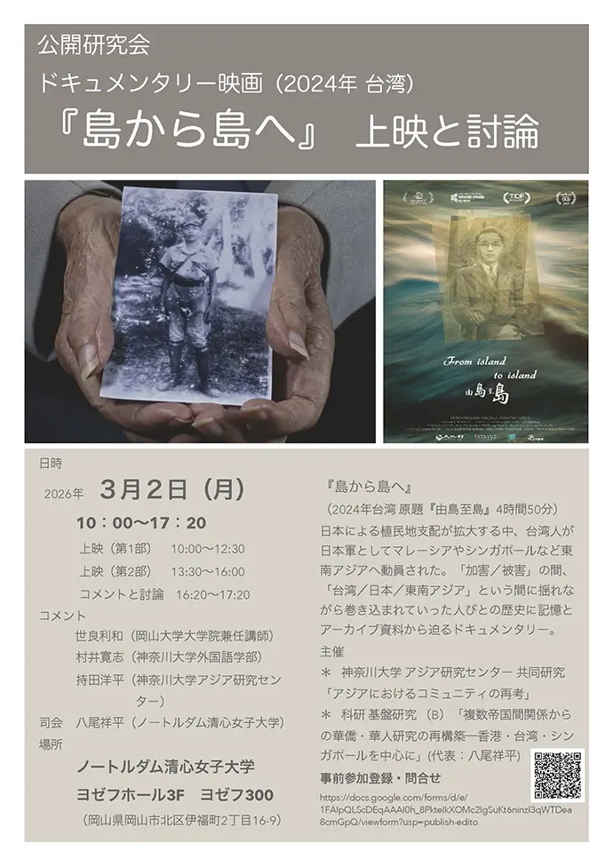 | 開催方法・内容 | ◇対面開催 ◇スケジュール 上映(第1部) 10:00〜12:30 上映(第2部) 13:30〜16:00 コメントと討論 16:20〜17:20 ◇コメント:世良利和(岡山大学大学院兼任講師) 村井寛志(神奈川大学外国語学部) 持田洋平(神奈川大学アジア研究センター) ◇司会:八尾祥平(ノートルダム清心女子大学) ◇場所 ノートルダム清心女子大学 ヨゼフホール3F ヨゼフ300 (岡山県岡山市北区伊福町2丁目16-9) ******************************************************************************* 『島から島へ』(2024年 台湾 原題『由島至島』 4時間50分) 日本による植民地支配が拡大する中、台湾人が日本軍としてマレーシアやシンガポールなど東南アジアへ動員された。そこで「加害/被害」の間、「台湾/日本/東南アジア」という間に揺れながら巻き込まれていった人びとの歴史に記憶とアーカイブ資料から迫るドキュメンタリー。 ◇共催 ・神奈川大学 アジア研究センター 共同研究「アジアにおけるコミュニティの再考」 ・科研 基盤研究(B)「複数帝国間関係からの華僑・華人研究の再構築―香港・台湾・シンガポールを中心に」(代表:八尾祥平) |