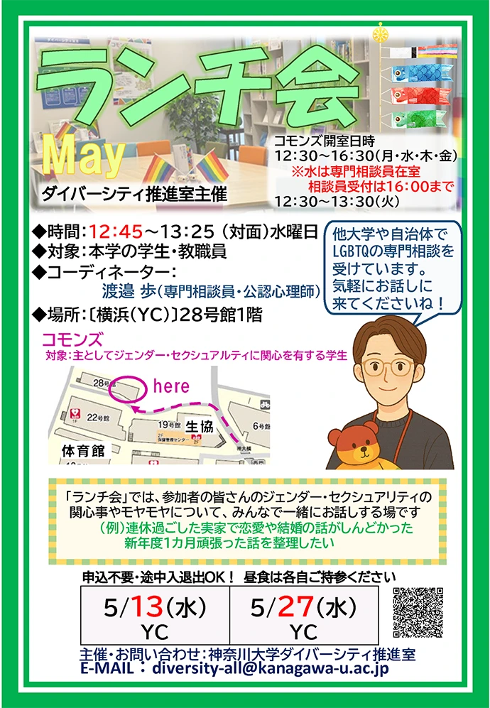 | 場所 | 【横浜キャンパス】 28号館1階111室 ※B1Fと誤認されやすい為、ご注意ください コモンズ(対象:主としてジェンダー・セクシュアリティに関心を有する学生) |