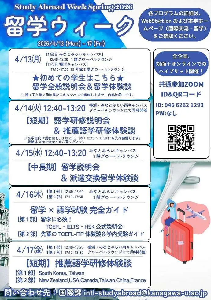 神奈川大学では、学生の皆さんに留学制度や海外研修プログラムについて広く知っていただくことを目的に、2026年度 春季「留学ウィーク」を開催します。