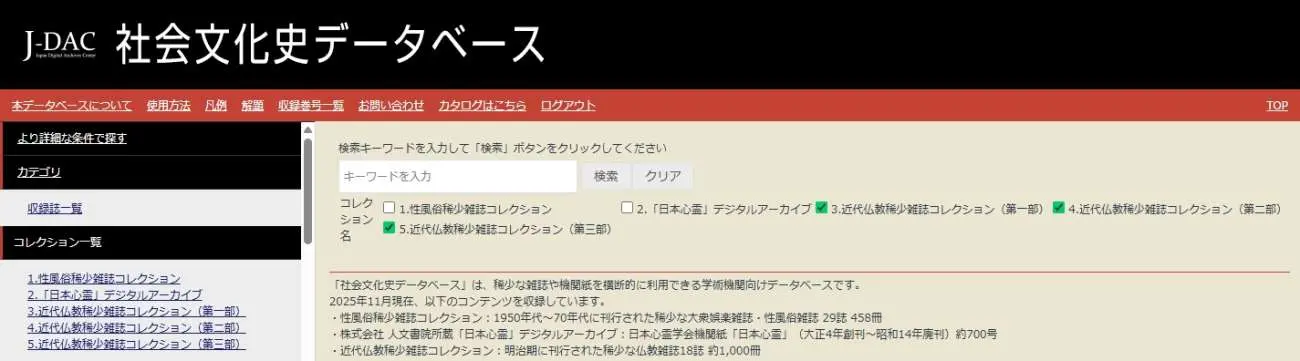 近代仏教稀少雑誌コレクションは、明治時代に発行された重要かつ稀少な仏教雑誌を横断的に利用できるデータベースです。J-DAC(ジャパンデジタルアーカイブズセンター)が提供する「社会文化史データベース」の収録コンテンツの一部として、他のタイトルと共通の検索画面を使います。「近代仏教稀少雑誌コレクション」だけを検索したい場合は、キーワード入力欄下部のチェック ボックスを選択してご利用ください。神奈川大学はコレクション全3部を契約しています。