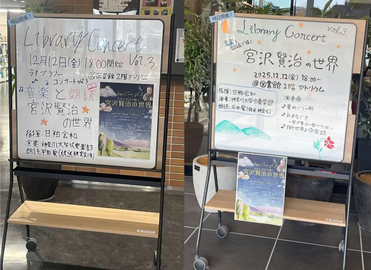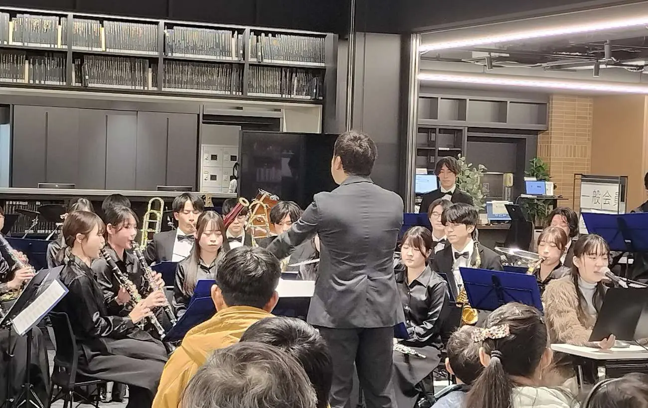 12月12日(金)、横浜図書館2階アトリウムにて、神奈川大学吹奏楽部と放送研究会の平田さんによるライブラリーコンサートを開催いたしました。