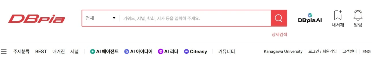 DBpiaは、韓国の電子ジャーナルを収録する全文データベースです。学術雑誌・学会誌・大学紀要などの掲載論文をPDF形式で提供しています。詳細検索画面では、多言語入力(漢字音読/漢字部首/古ハングル/日本語/ロシア語)が可能です。