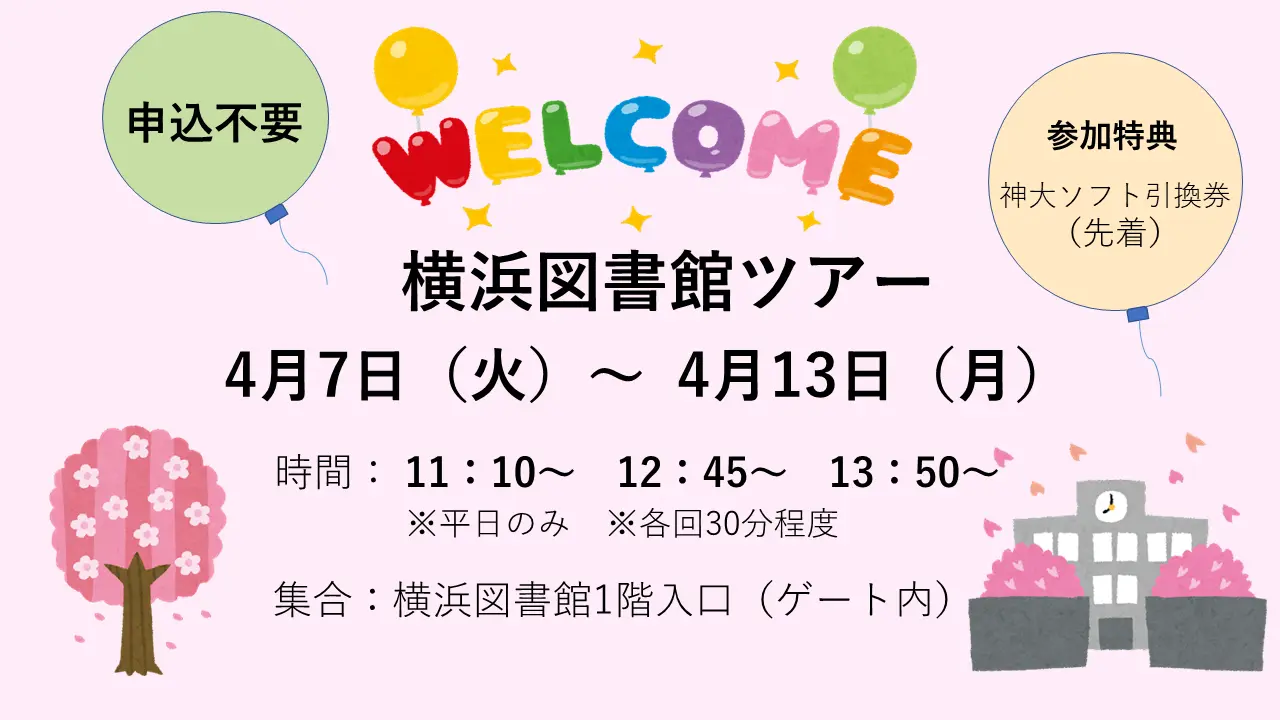 | 概要 | 横浜図書館(15号館)の館内施設、サービスについて紹介します。 |
