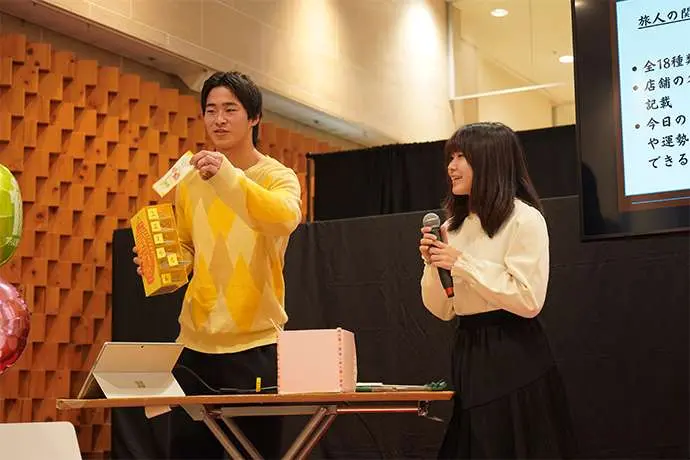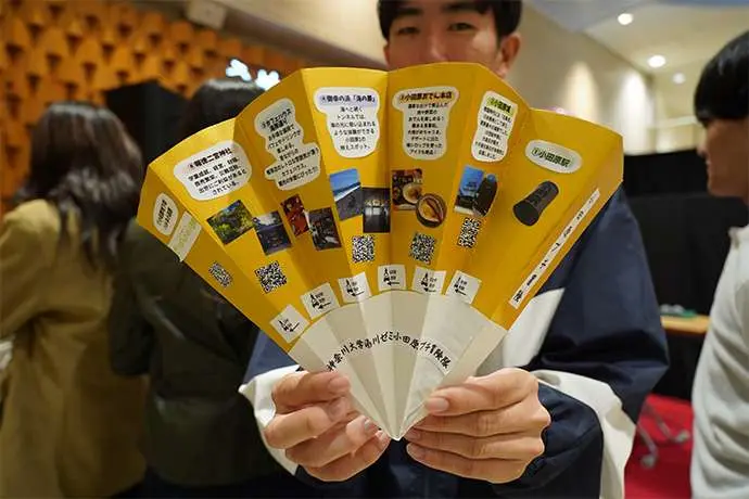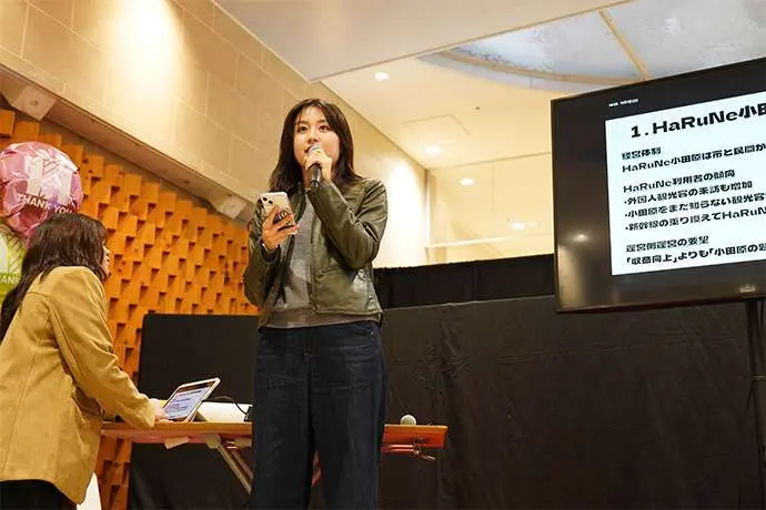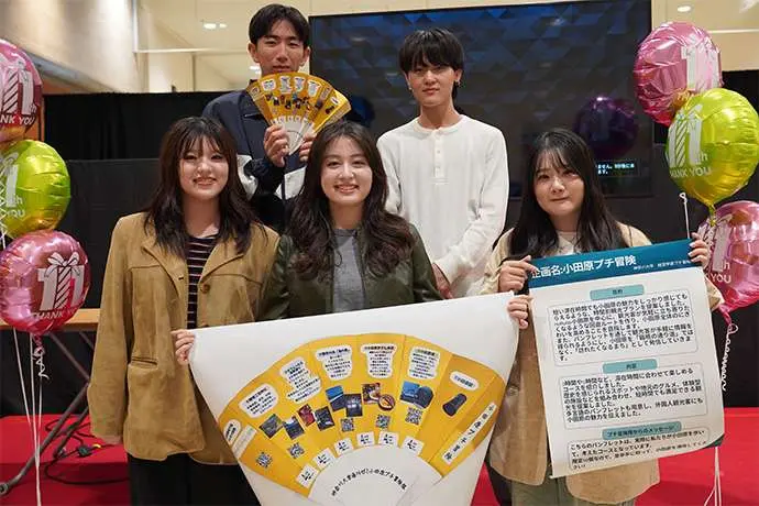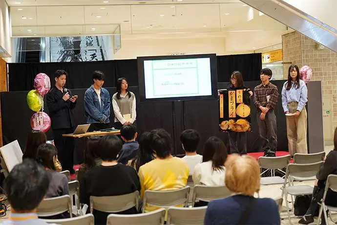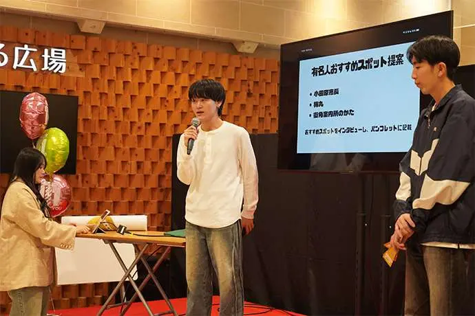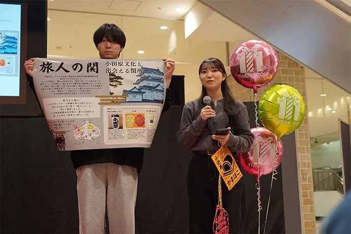 6月23日にキックオフした同プロジェクト。小田原市職員からの情報インプットをいただいた後、学生はチームに分かれ、地元の魅力を伝える情報発信、交流イベント、学生ならではの視点を活かした展示や企画などハルネ小田原を「まちと人がリンクする“交流のハブ”」として活用するアイデアを検討してきました。そして11月1日(土)、ハルネ小田原「うめまる広場」にて検討したアイデアを発表しました。