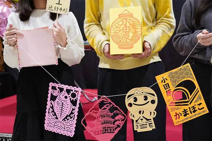 かつて多くの旅人が行き交う宿場町として栄えた小田原。市民や観光客の居場所となっているハルネ小田原を通る皆さんが心休まる楽しい時間を過ごしてほしいという願いから小田原の名所や名産品の切り絵をみなとみらいキャンパスのファブラボにて制作し、ハルネ小田原の区画で11/1~11/3まで期間限定で展示しました。