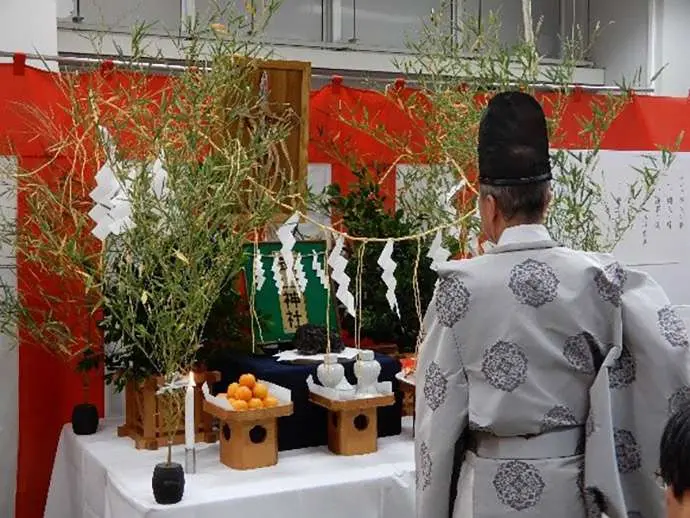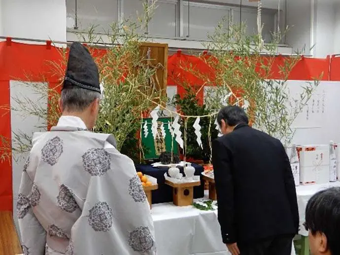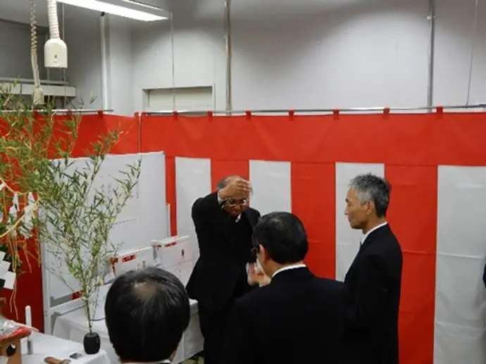 熊野神社宮司によるご祈祷の後、石渡卓 理事長、戸田龍介 学長、田村忠久 工学部長、花嶋とみ子 事務局長、伊東弘行 機械工学科主任、江上正 機械工作センター長、山口光弘 機械工作センター職員代表による玉串奉納を行い、機械工作センターの一年の無事故を感謝し、また新たな一年の安全を祈願しました。