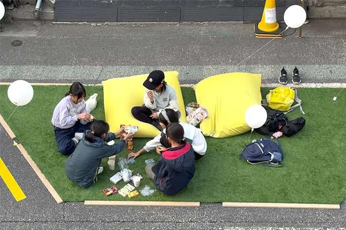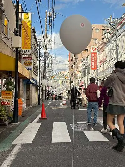 まち再生コース上野研究室では、会場デザイン、設営、通行者の行動調査、アンケート調査を担当しました。当日は、200個の風船を路上に並べ、商店街という長い空間の特性を視覚化しました。また、人工芝にヨギボーを置いてゆったり過ごすことができるスペースや路上にチョークでお絵描きができるスペースを設置したほか、飲食店の前には路上で飲食ができる食堂スペースを配置しました。