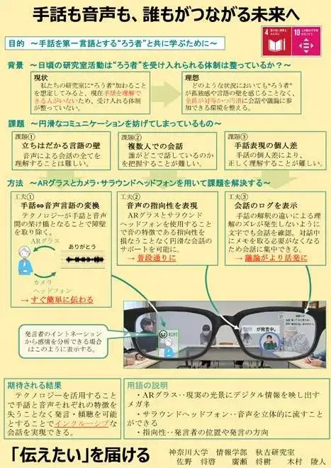 留意した点は、ポスターのアイデアが一目で伝わるシンプルさを重視したことです。工夫した点は、ポスターに使用する絵をChatGPTで仮想現実として作成したことと、プレゼンで実演を交えてアイデアを詳しく説明したことです。受賞できて嬉しく、アイデアに共感してもらえたことが何より嬉しいです。今後は、このアイデアを現実に実現できるよう努力したいと思います。