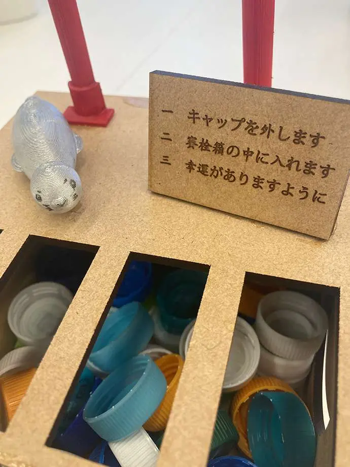 本年度はこの取り組みに続き、分別回収の仕方に着目し、同ゼミの学生がナッジ(※)を活用したアイデア創出を行いました。学生は、「思わずペットボトルからキャップを取り外し、回収BOXに入れたくなる仕組み」を検討し、同キャンパス1Fファブラボみなとみらいにあるデジタル工作機器等を駆使してプロトタイプを制作しました。