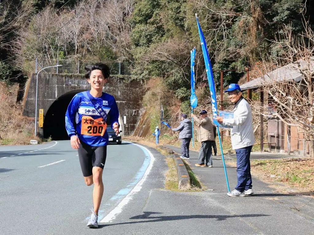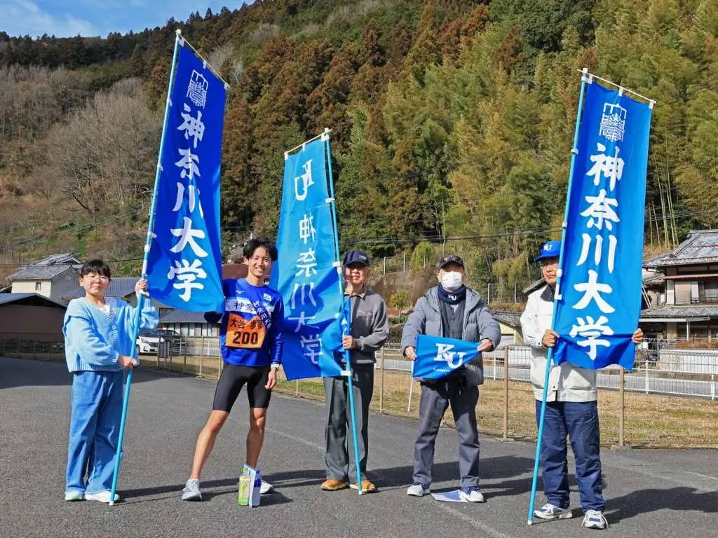 大会当日は、午前中に内子町民会館で開会式が行われ、大岩さんがエントリーする「高校男子・一般の部」は正午に五十崎自治センター前から競技スタート。本学駅伝チームが箱根駅伝時に着用するユニフォーム姿で「神奈川大学」の襷を掛けた大岩さんは、沿道に集まった町の皆さまや現地在住の本学卒業生からの声援を受けながら、全7区間(22.4km)を一人で駆け抜け、先頭を走る内子高等学校陸上競技部チームのランナーと共にゴールテープを切りました。