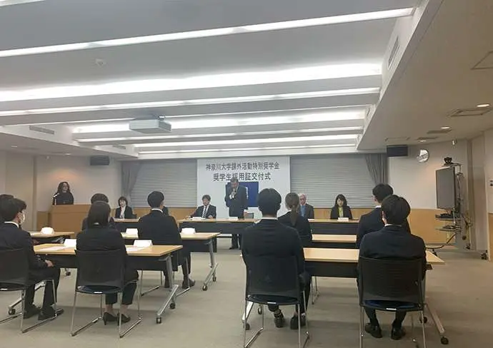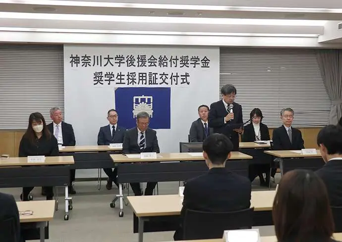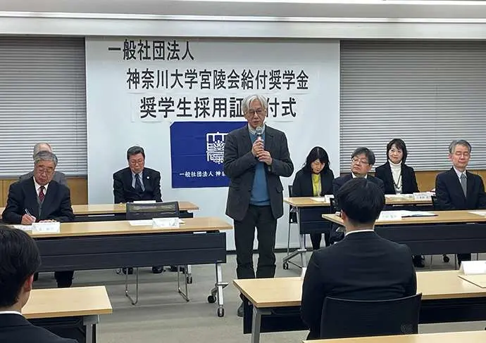 2025年12月24日(水)に、「一般社団法人神奈川大学宮陵会給付奨学金及び大学院給付奨学金」、「神奈川大学課外活動特別奨学金」、「神奈川大学後援会給付奨学金」、「村橋・フロンティア奨学金」の採用証交付式および授与式が横浜キャンパス1号館で開催されました。