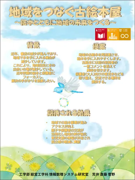 私たちは、書店減少により地域で本と出会う機会が減る課題を取り上げました。古絵本を地域で循環させ、前の持ち主の一言メッセージで次の読者の関心を広げる仕組みを提案します。読み聞かせ、育児本の導入で交流の場として地域のつながりを強め、保護者の学びと相談のきっかけを作ります。回収、貸出は古絵本屋で完結します。水彩の絵本風背景と低彩度配色で温かさと安心感を演出し、直感的に内容が伝わるデザインを重視しました。