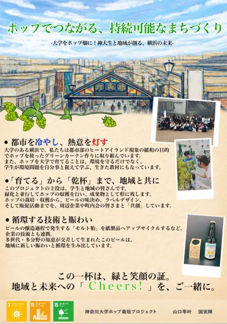 本活動は都市部のヒートアイランド現象等の環境課題に対し、ホップを用いた屋上緑化を通じて学生が環境問題を自分事として捉えるための実践的プロジェクトです。横浜キャンパスでは近隣町内会の方々と共に、生育や収穫、成果品となるビールの企画から販促までを行い、多世代間の交流、共創も実現しました。また、モルト粕を再生した紙の活用など資源循環も追求。ホップを通じた地域との共創により、持続可能な未来を醸成します。