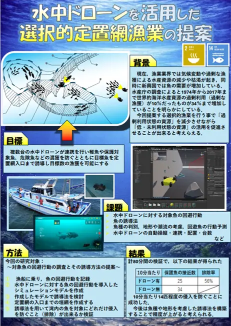 本作品はSDGs目標14「海の豊かさを守ろう」に関連し、水中ドローンを活用した新しいスマート漁業を提案するものである。過剰利用状態にある魚種については網への侵入を管理し、低利用状態にある魚種については網内へ誘導する事で、海洋資源の持続的な利用を目指す。最終目標の第一段階として、実際に調査したデータを用いたシミュレーションモデルを構築し、誘導方法を検討した。さらに実海域で検証を行い、効果を確認した。