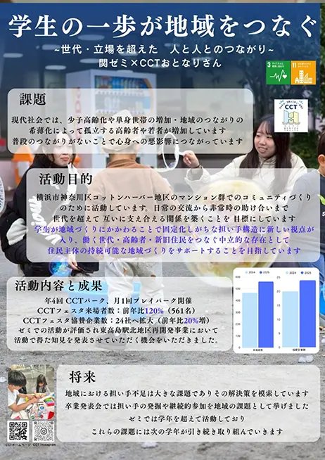 横浜市神奈川区コットンハーバー地区において、学生が主体となり多世代交流を軸としたコミュニティ形成を目指す取り組みです。少子高齢化や地域の孤立化が進む中、学生が中立的なつなぎ役として関わり、新旧住民や働く世代、高齢者の相互扶助を促す仕組みを構築しています。活動で得た知見は再開発事業にも還元され、今後は学年を超えた継承を通じて、地域の担い手不足の解消と持続可能な地域社会の実現を目指していきます。