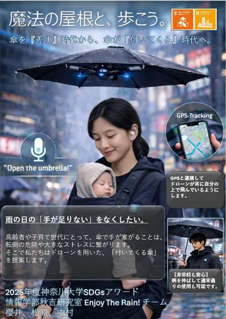 ドローン技術を活用した浮遊型の傘という新発想で、雨天時の移動負担や危険の軽減を目指した点を高く評価しました。手が空くことで子育て世代や高齢者の外出支援につながり、安心して暮らせるまちづくりへの貢献が期待されます。「傘を差す時代から、傘が付いてくる時代へ」という新たな価値創出に挑む、社会的意義の大きい提案です。