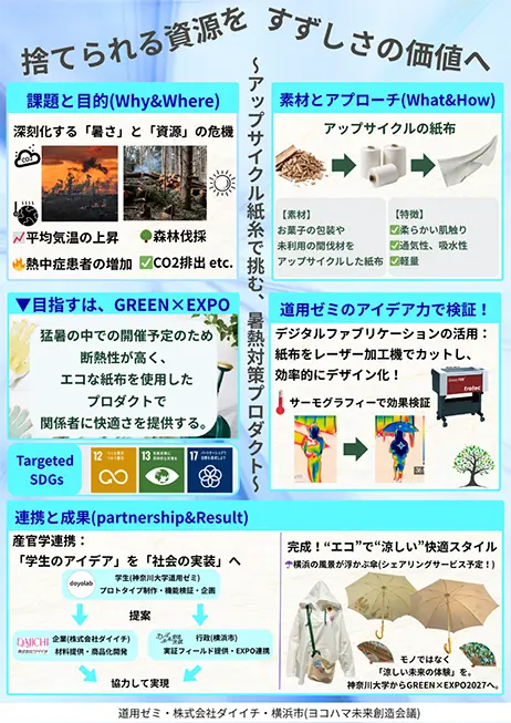 近年、気温の上昇や森林伐採等の課題が挙げられている。それらの課題に対し「環共(環境と共創する)」をテーマに、捨てられていた紙資源や未利用間伐材をアップサイクルし、紙糸・紙布として再生することで、暑熱対策に役立つ製品へと転換する取り組み。産学官連携によりGREEN×EXPO 2027での実用化、普及を目指しており、横浜市の風景が映る傘や、扇子、ポンチョの製品が完成した。