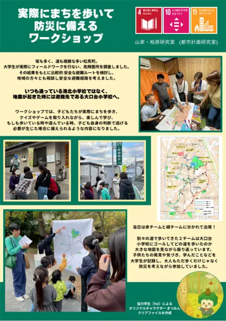 神奈川大学の山家・柏原研究室が松見町で実施した、防災ワークショップの報告です。大学生がフィールドワークで調査した危険箇所に基づき、地震時の避難先である大口台小学校への安全なルートを検討しました。当日は子供たちが2チームに分かれ、クイズやゲームを交えて実際に町を歩き、自ら判断して逃げる力を養いました。最後は大きな地図で発見を共有し、楽しみながら地域の防災意識を高める活動となりました。