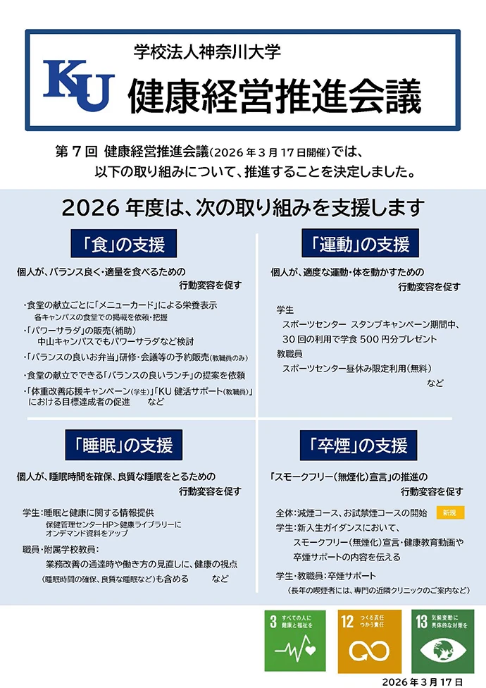 2026年3月17日に、「第7回学校法人神奈川大学 健康経営推進会議」 が 開催されました。