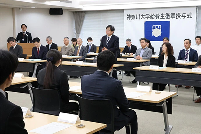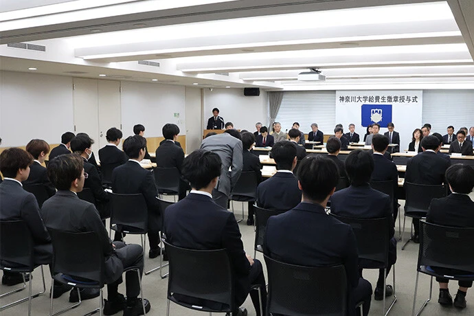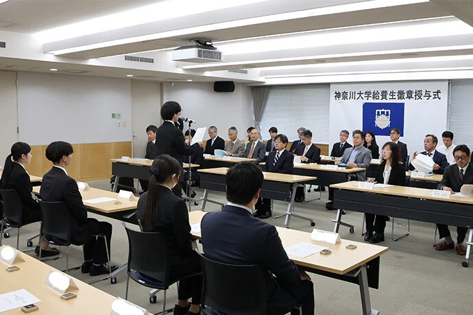 「2026年度米田吉盛教育奨学金 神奈川大学給費生徽章授与式」が4月6日(月)、横浜キャンパス1号館で開催されました。
