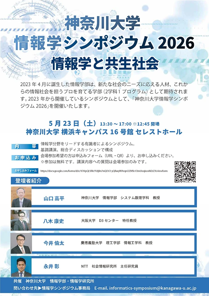 このたび、情報学分野に関する学びや取り組みを共有する場として、2023年より継続的に開催しているシンポジウム「神奈川大学 情報学シンポジウム2026」を開催いたします。皆様のご参加をお待ちしております。
