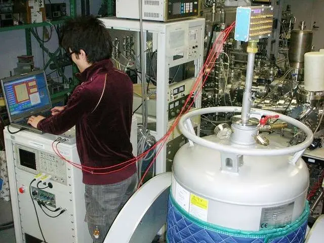 専門で研究しているのは<超伝導>です。分かりやすく説明するのはなかなか難しいですが、例えばリニアモーターカーは、<超伝導>の物を浮かせる作用を利用しています。また、<半導体>という言葉を聞いたことがあるかと思いますが、これは、もはや皆さんの生活になくてはならない、パソコンや携帯電話の中の集積回路(IC)にも使われています。<超伝導>は、この<半導体>の弟のようなもの、と言うとピンとくるのではないでしょうか。これはまだ研究段階ですが心臓や脳の作り出す磁界を計測することが試みられていて、医学的な応用にも発展している分野で、皆さんもすぐ<超伝導>のユーザーになるでしょう。研究室では<超伝導>の薄膜と電子素子を製造して、様々なデータを測定しています。