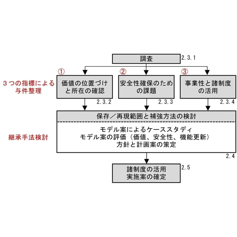 長く生き続けてきた建物というのは、時間の経過の中で利用方法が変化したり、エアコンなど設備面で手が加えられたりしています。建築の価値継承を行う場合には、第一にその建物が建てられた当初の歴史を伝えるという趣旨で、当初から何が変わって何が変わっていないのかを見極める必要があります。一方で、当初だけに価値があるのではなく、積み重ねられてきた時間の中ででき上がった姿がよかったりもします。そうした愛着のようなものも含め多様な視点で価値の位置づけと所在を明らかにし、次世代にその価値を伝えるための回答を出さねばなりません。そのために、図面や文書などの史料調査、建物調査を丹念に行います。さらに、長く活用していくためには耐震性や火災安全性などの課題を明らかにし、時代の要求に応えた機能に高めていく必要があります。